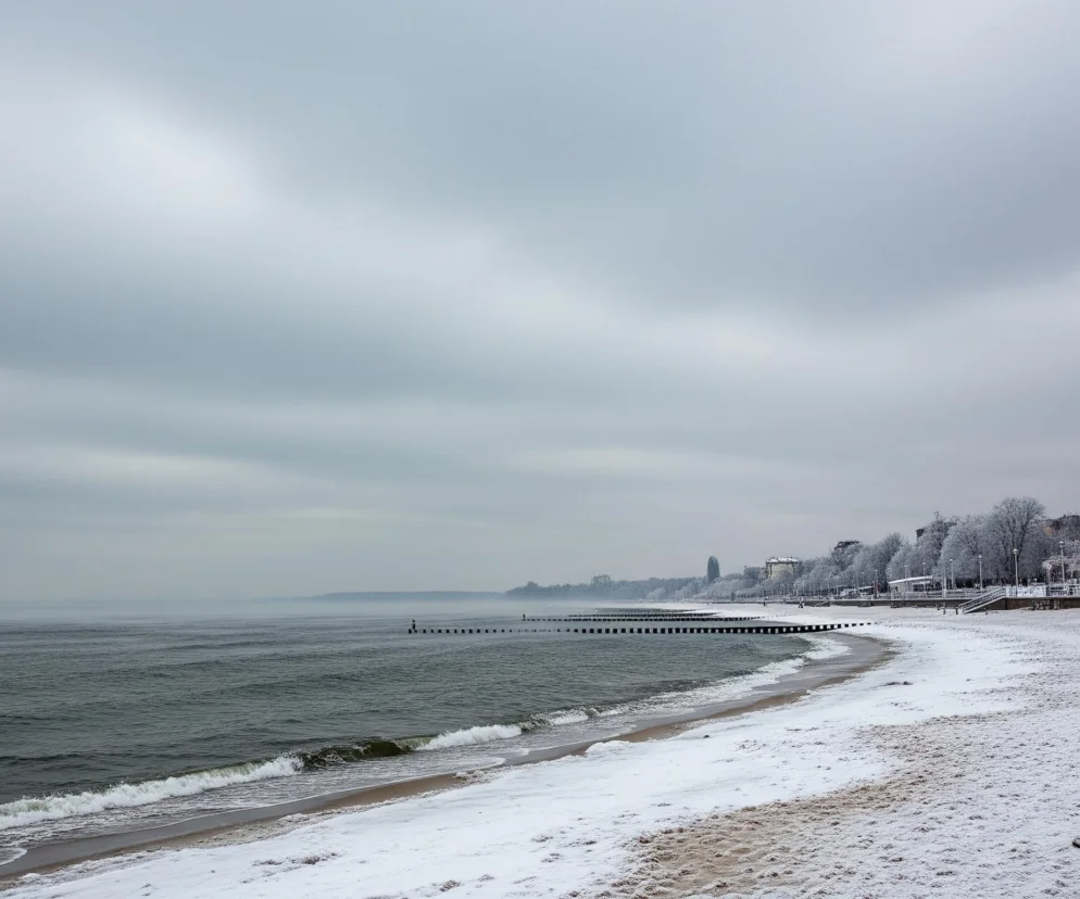 Autor: Alert Pogodowy AI/ Wygenerowane przez AIZimowy krajobraz przedstawia zaśnieżoną plażę i wzburzone morze pod zachmurzonym, szarym niebem. Na pierwszym planie, z prawej strony, leży szeroki pas piasku pokryty nierówną warstwą białego śniegu, przeplatanego odsłoniętymi fragmentami brązowego piasku. Morze o ciemnozielonym kolorze faluje, a przy brzegu tworzą się białe, spienione fale.