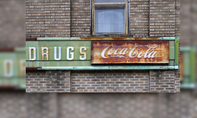 Rząd ciemnych butelek z napojem w szklanej, przezroczystej butelce ustawiony jest na półce lub ekspozycji. Butelki mają czerwone etykiety z białym, stylizowanym napisem "Coca-Cola". Na etykiecie środkowej butelki widać biały kod kreskowy, a obok niego tekst "INGREDIENTS" oraz "750 g". Krawędzie butelek i górne części są oświetlone, ukazując odbicia świateł w kształcie wydłużonych, białych punktów i linii na czarnym tle napoju.