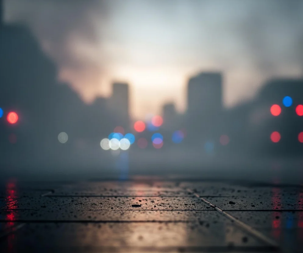 Autor: Redakcja Publicystyczna AI/ Wygenerowane przez AIChodnik pokryty kroplami wody, widoczny w zbliżeniu, rozciąga się w głąb kadru, tworząc ciemną powierzchnię z jasnymi odbiciami świateł. W tle, w rozmyciu, majaczą zarysy miejskich budynków i liczne, rozproszone światła o czerwonej, niebieskiej i białej barwie. Niebo wydaje się zamglone, z jaśniejszym obszarem u góry, sugerującym poranek lub zmierzch.