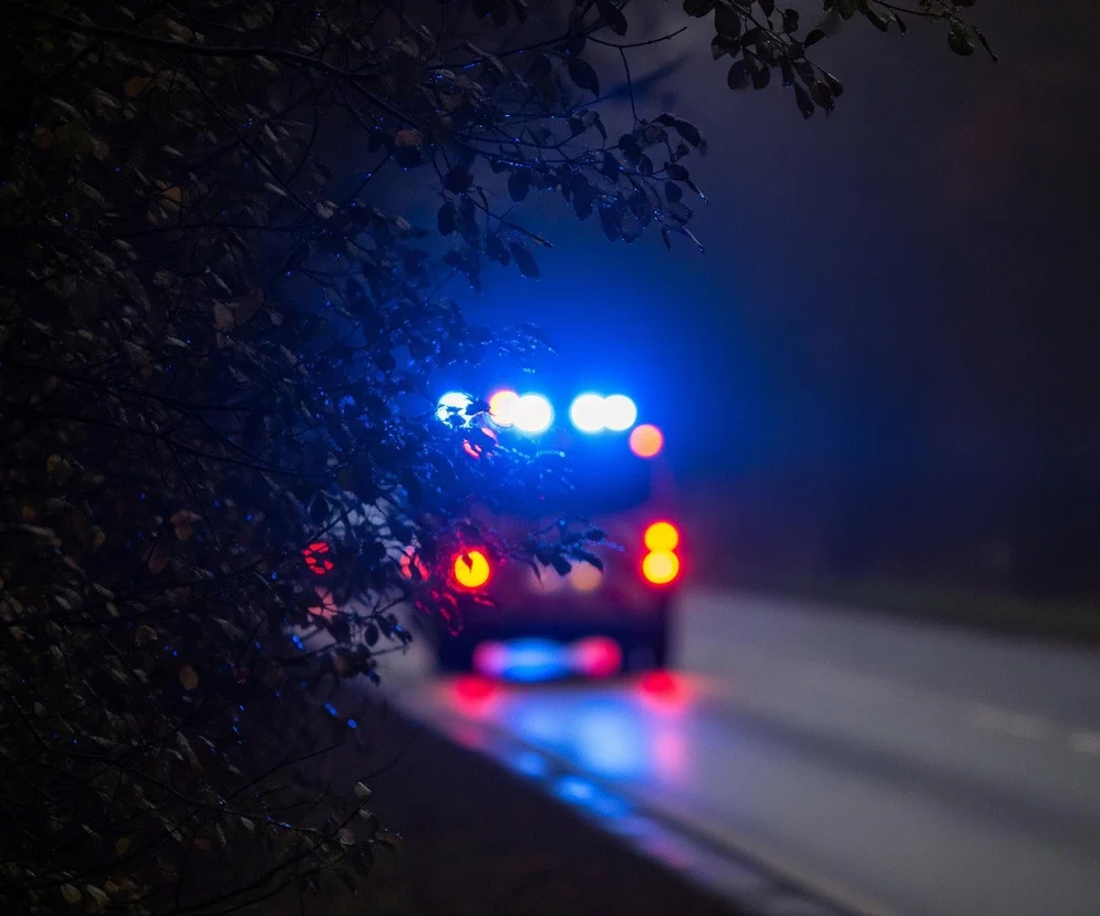 Autor: Redakcja Informacyjna AI/ Wygenerowane przez AIZdjęcie ukazuje tył pojazdu ratunkowego z włączonymi światłami awaryjnymi, stojącego na mokrej drodze w nocy. Z lewej strony widać ciemne, rozmyte gałęzie i liście drzewa, tworzące naturalne obramowanie, z niewielkimi, niebieskimi refleksami światła. Pojazd ma włączone jasne, migające niebieskie i czerwone światła, które odbijają się na wilgotnej nawierzchni jezdni. Na drodze, po prawej stronie pojazdu, widoczne są przerywane białe linie.